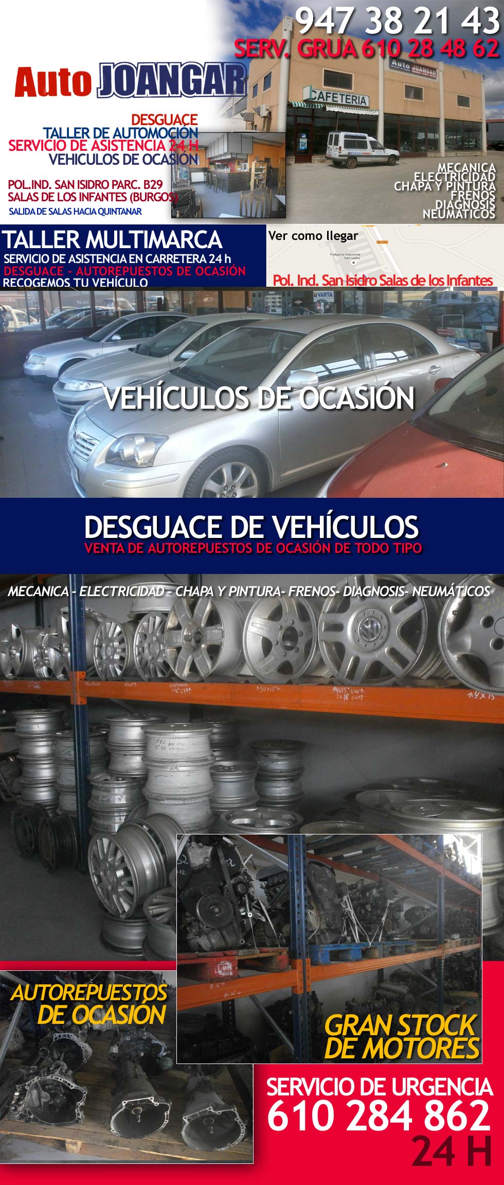 Talleres Auto Joangar s.l., Poligono industrial San Isidro Parcela B29, Salas de los Infantes, Burgos, 947382143, Desguace en Salas de los Infantes, Autorepuestos en Burgos, Venta de piezas de ocasion en Salas de los Infantes, Recambios de ocasion en los pinares, Taller en Salas de los Infantes, Asistencia en carretera 24H, Servicio de Gruas en Salas de los Infantes, Autorepuestos de ocasion en Salas de los Infantes, Servicio de neumaticos , Taller multimarca, Neumaticos usados, piezas de segunda mano para el coche en Burgos, Mecanica, electricidad, neumaticos, chapa y pintura, frenos, inyeccion, diagnosis, servicio de grua, reparar el coche en los pinares, arreglar el coche en Salas de los Infantes, mecanicos profesionales, seguro de asistencia en carretera, todas las marcas, taller multimarca, reparacion de vehiculos, turismos, furgonetas, coches, motores, Vehiculos de ocasion en Salas de los Infantes, Coches de segunda mano en los pinares, arreglar el coche en Salas de los Infantes, pintar el coche en Salas de los Infantes, poner ruedas en Salas, cambiar las ruedas del coche en Salas de los Infantes, mantenimiento de vehiculos, cambios de aceite y filtros, Talleres en la carretera de Soria, Desguace de coches en la carretera de Soria, Taller de mecanica en la carretera de Soria, Recogemos su vehiculo y Tramitamos la baja de su vehiculo, transmisiones, cajas de cambio, motores, Venta de motores usados, venta de motores de ocasion, llantas de ocasion, piezas de coches. Desguace en Salas de los Infantes. Burgos.